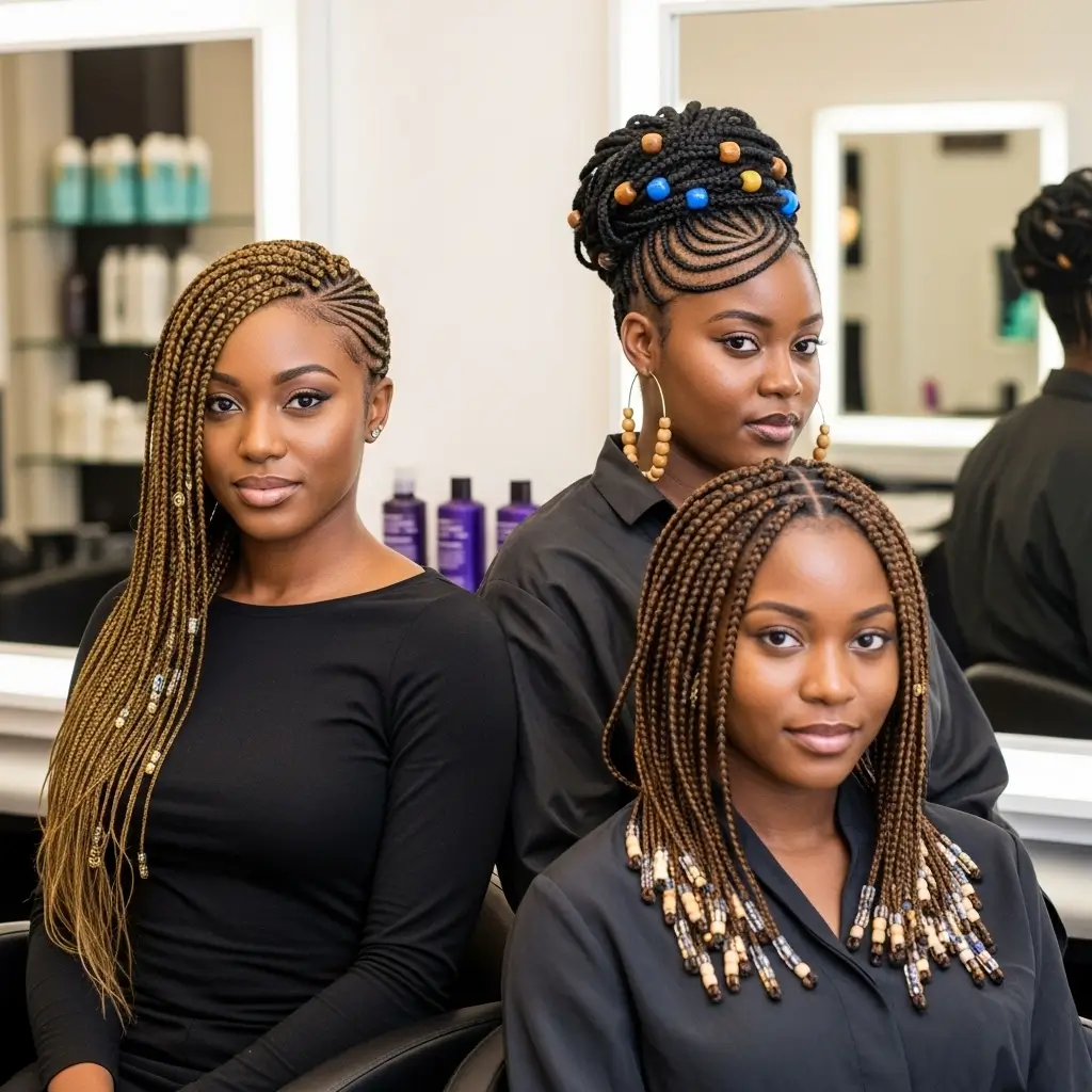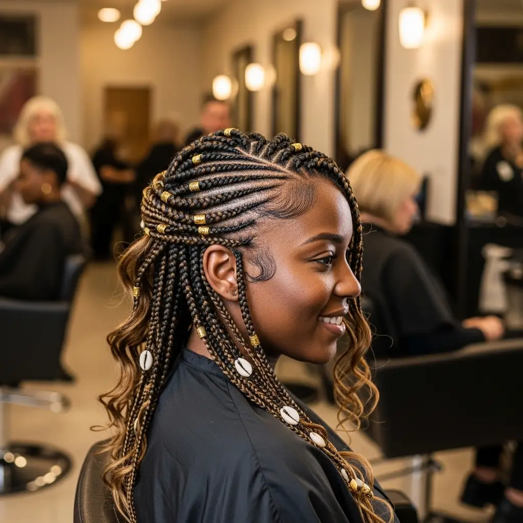 The signature pattern with braids flowing from front to back, combined with strategic beads, creates a look that’s both traditional and Instagram-worthy.