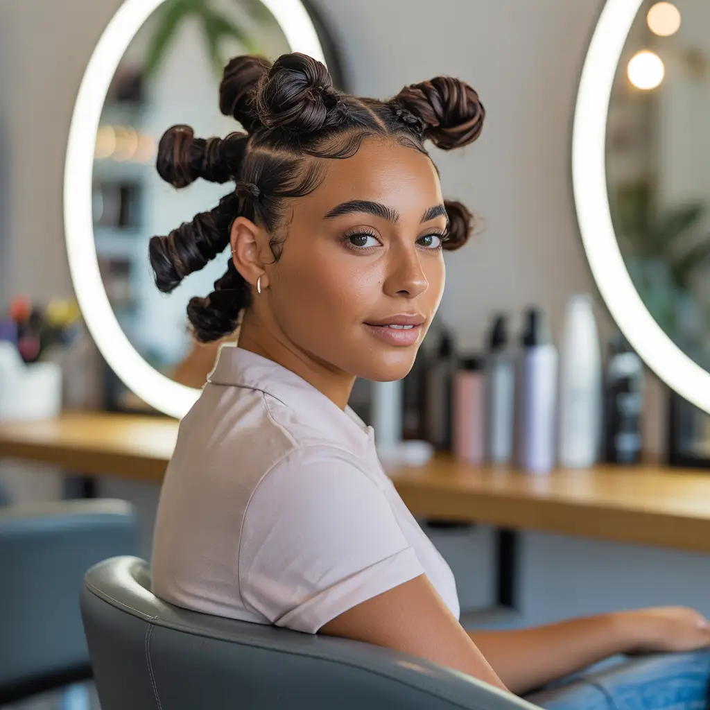 Space buns on curly hair hit differently than on straight hair – they’re fuller, more textured, and honestly more fun. This playful style works for concerts, festivals, or when you want to feel like a carefree baddie.