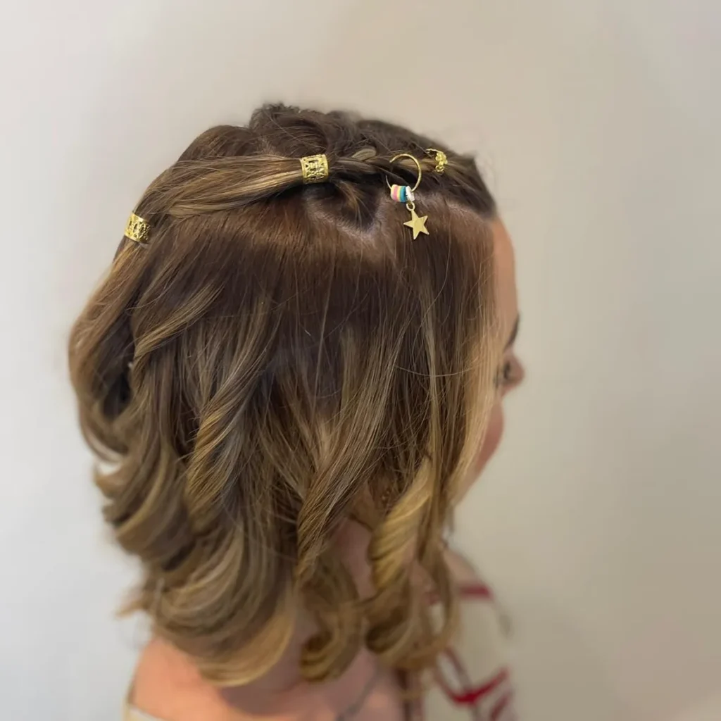 Creating this look is surprisingly simple. Gather the top section of your hair—you don’t need all of it, just enough to create a small, cute knot at the crown. Twist the section and wrap it around itself to create a mini bun, securing it with bobby pins or a small elastic. The magic comes from the accessories: delicate gold rings, star charms, or decorative bobby pins woven throughout the knot and the hair leading up to it. These metallic accents elevate what could be a basic everyday style into something special and eye-catching. The loose, textured waves in the bottom section keep the look balanced and prevent it from feeling too top-heavy. @sc_modelme showed us how to make this work beautifully on shorter hair, incorporating just the right amount of bling without going overboard. It’s the perfect style for festivals, casual parties, or anytime you want to add a little extra fun to your look.