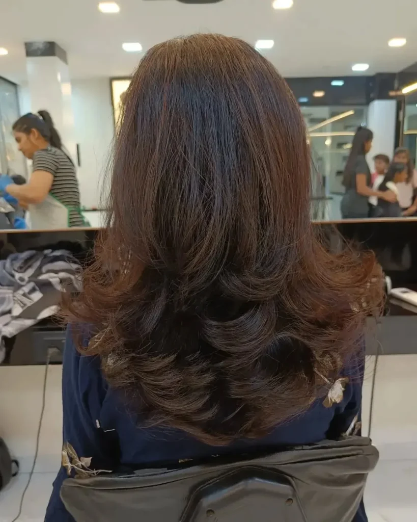The secret to nailing this look is all in the technique. Start with freshly washed hair and apply a volumizing mousse from roots to ends. Using a round brush while blow-drying, work in sections to create lift at the roots and smooth, rounded ends. Once your hair is completely dry, use a large-barrel curling iron to create soft, loose waves throughout. The magic happens when you curl away from your face—this creates that glamorous, face-framing effect that’s universally flattering. After curling, run your fingers through the waves to break them up slightly, then finish with a light-hold hairspray to keep everything in place without losing that touchable, moveable texture. @hairby_mahesh demonstrated the technique perfectly, creating a look that’s polished enough for special events but relaxed enough for everyday wear. The subtle highlights throughout add even more dimension to the waves.