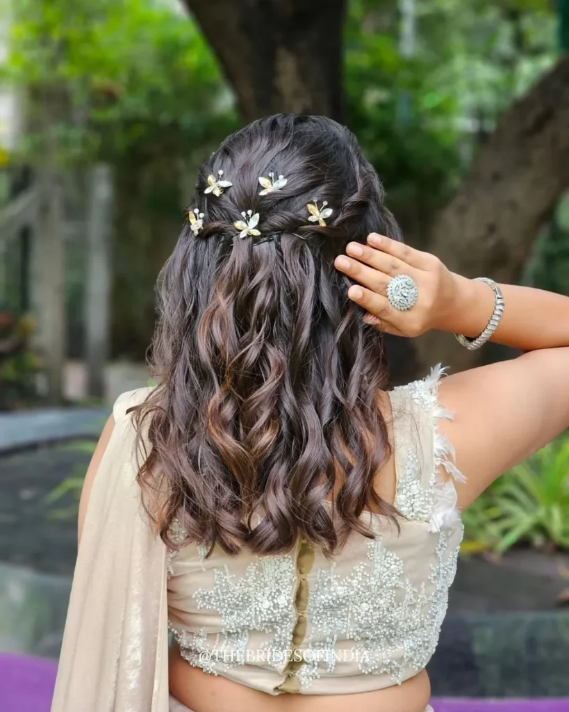 To recreate this gorgeous look, start by sectioning off the top portion of your hair, leaving the bottom half down to flow freely. Take small sections from either side of your head and gently twist them back, securing them at the crown with bobby pins. The key here is to keep things soft and romantic—you’re not going for a severe, tight twist. Instead, allow a few face-framing pieces to escape for that lived-in, effortless vibe. Once your twists are secured, tuck small floral clips or fresh flowers into the twisted section. White flowers like baby’s breath or small daisies work beautifully for this ethereal aesthetic. @thebridesofindia showed us exactly how it’s done, creating a look that’s perfect for garden parties, brunches, or even intimate weddings. The gentle waves throughout add dimension and movement, making this style feel incredibly romantic and feminine.