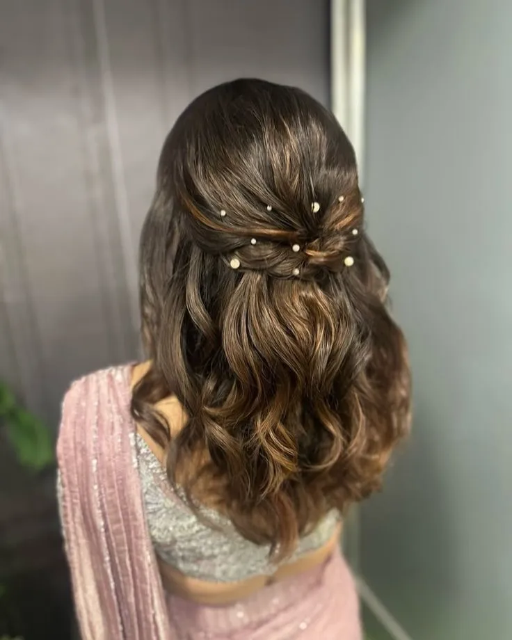 The styling is beautifully straightforward. Gather the top section of your hair, leaving the lower portion down in soft waves. Instead of twisting or braiding, simply pull the hair back smoothly and secure it at the crown with a clear elastic. Then comes the fun part: strategically placing pearl-adorned bobby pins throughout the gathered section. The key is to create a scattered, organic pattern rather than a straight line—this keeps the look feeling fresh and modern rather than dated. The gorgeous waves throughout the rest of the hair provide the perfect backdrop for those luminous pearl accents to really shine. What we love about @monsoonweddings‘s interpretation is how the pearls catch the light, adding subtle glamour without overwhelming the overall look. It’s proof that sometimes the smallest details make the biggest impact.