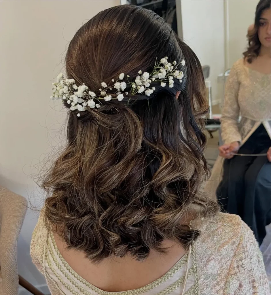 Nothing says effortless romance quite like a half-up hairstyle adorned with delicate flowers. This look is perfect for those special occasions when you want to feel a bit more dressed up without committing to a full updo. The beauty of this style lies in its simplicity—you’re working with the natural texture and movement of your hair while adding just enough structure to feel polished.