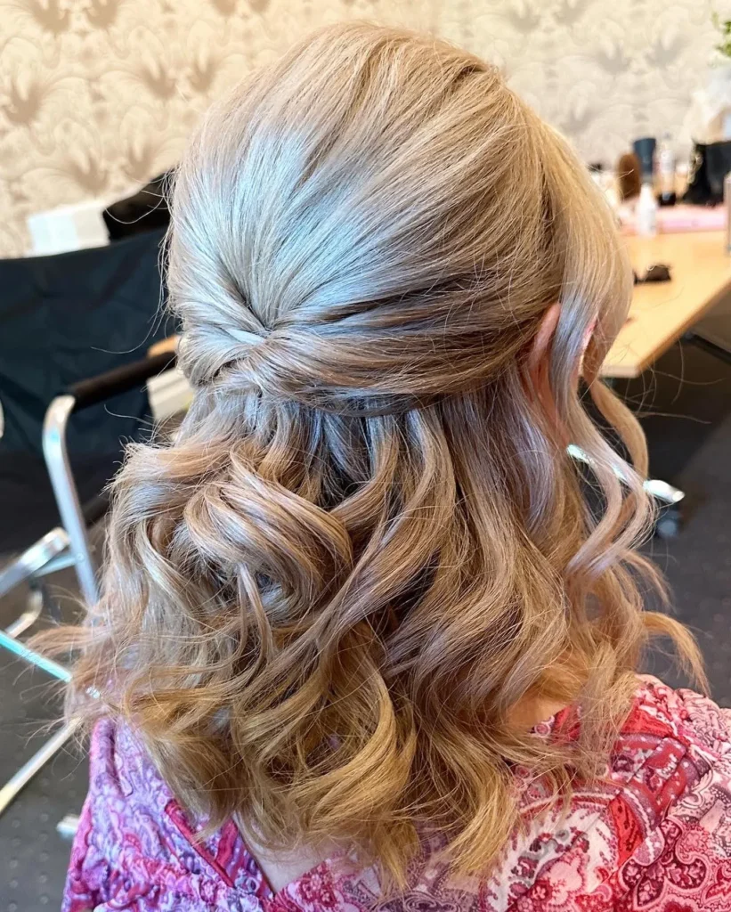 Here’s another take on the half-up style that’s absolutely perfect for medium-length hair. This version features a beautifully twisted section at the crown that creates gorgeous texture and visual interest. The hair has been curled into soft, bouncy waves with a subtle ombre effect that transitions from darker roots to lighter, golden ends.