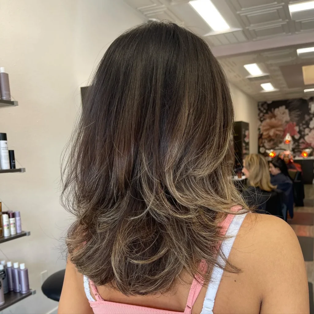 If you’re dreaming of hair that looks like you just got back from a beach vacation, this sun-kissed balayage is calling your name. The color work here is absolutely stunning—a beautiful blend of dimensional browns and warm caramel tones that create depth and movement. The medium length allows the balayage to really shine, showing off the gradual color transition from darker roots to lighter ends.