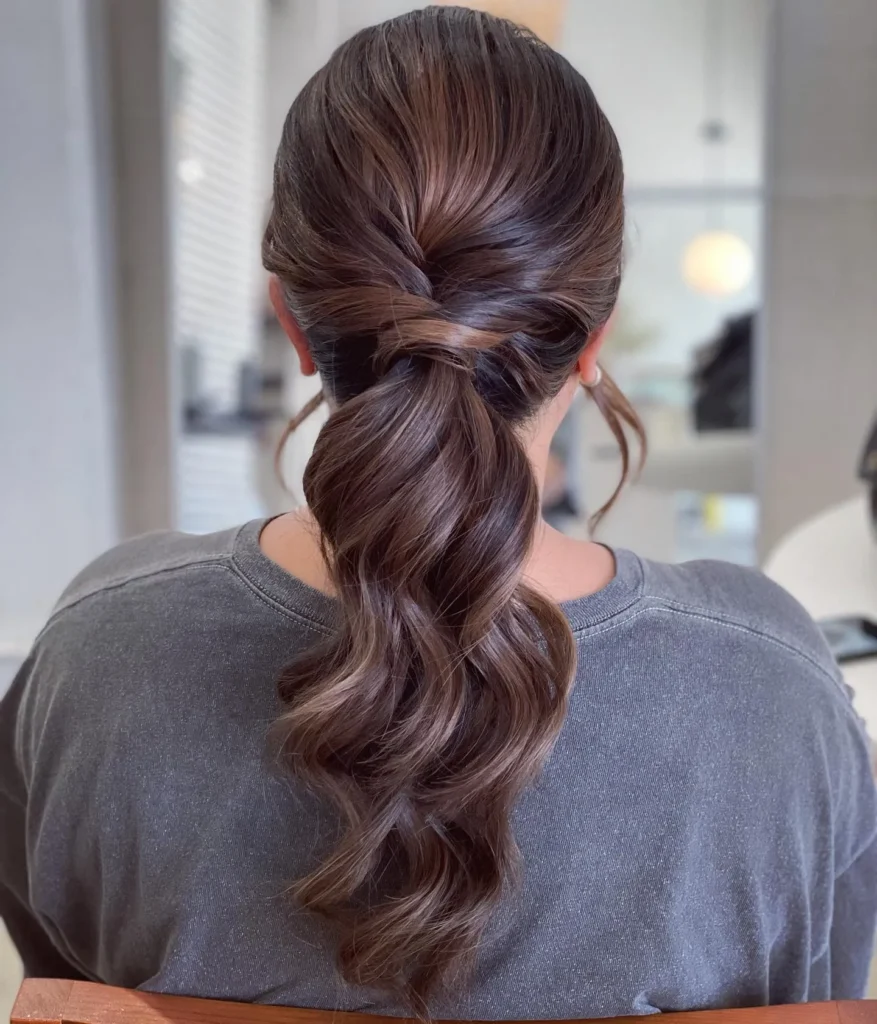 Here is where things get editorial. This sleek low ponytail has a subtle architectural detail that elevates it entirely: the base isn’t just gathered — it’s twisted and knotted, creating a sculptural focal point where the hair is secured. The rest falls into smooth, flowing waves that catch the light beautifully. There are no accessories here because none are needed. The technique is the accessory.