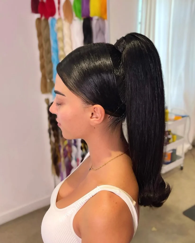 @everylittlestrand captured this from the side to show the stunning structural height at the crown, and it’s immediately clear why this style has been a fixture on fashion week runways for years. This is the pony you wear when you want everyone in the room to notice that you’ve arrived. Add gold jewelry and a sleek outfit, and it becomes something close to iconic.