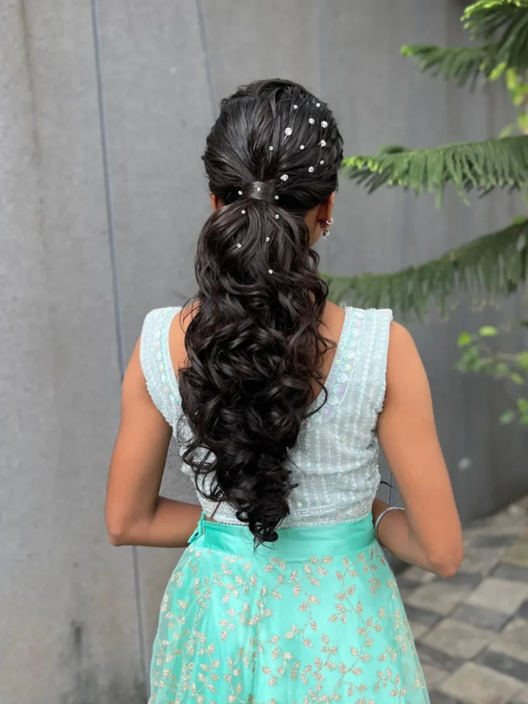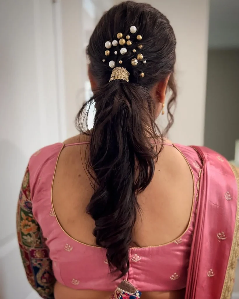This look is understated luxury, and it’s so beautifully suited to an Indian wedding context. A textured, slightly messy low ponytail is secured with an ornate golden hair pin and a small traditional hair clip, and around the base, an array of pearl and gold bead pins are arranged in a starburst pattern — dramatic up close, subtle from a distance. The tail itself is left loosely wavy, slightly undone, giving the whole thing a lived-in quality that feels modern.