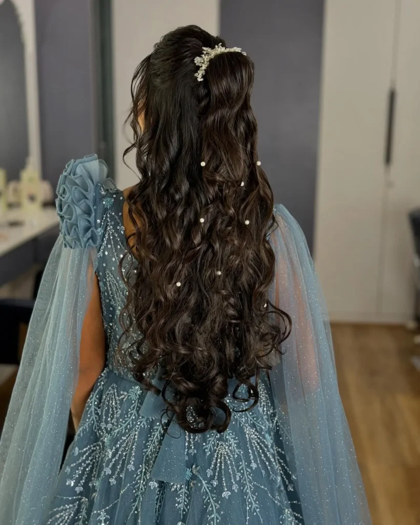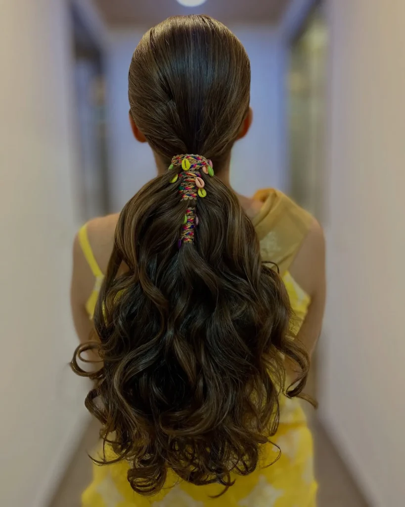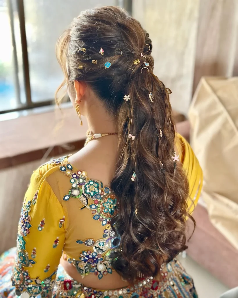 This one is pure joy, and it was made for a mehendi or haldi ceremony. Picture a classic half-up ponytail on a warm brunette base, then imagine someone went absolutely wild with the most charming accessories you’ve ever seen — tiny enameled moons, miniature bows, butterflies, stars, starfish, and gold hoops, all clipped into the parted sections near the crown and tumbling down through the curls. The result is playful, personal, and utterly festive.