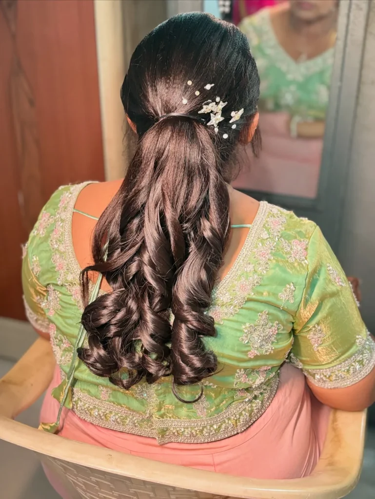 Low-pony lovers, this one’s for you. The hair is swept back into a low, soft ponytail with a small floral hair comb and delicate scattered pearl pins at the crown. The ponytail then splits and falls open in a fan of large, luscious curls — almost like a floral arrangement in hair form. There’s something genuinely old-school romantic about it, reminiscent of classic South Indian bridal styling but with a contemporary softness.