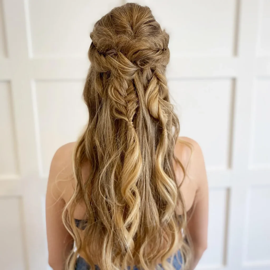 The beauty of this style is how well it works with flower crowns, jeweled headbands, or even small fresh blooms tucked into the braids. It’s particularly stunning for outdoor or garden-themed proms, and it holds up incredibly well even if you’re dancing all night long.