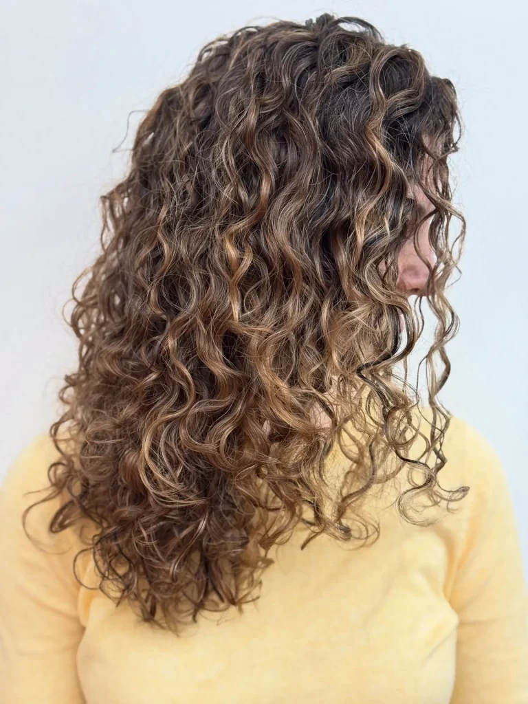 Deep, rich brunette tones on curly hair create an incredibly sophisticated and sultry look that’s perfect for summer evenings. This style leans toward looser, more relaxed waves rather than tight spirals, giving a soft, romantic vibe that’s undeniably elegant.