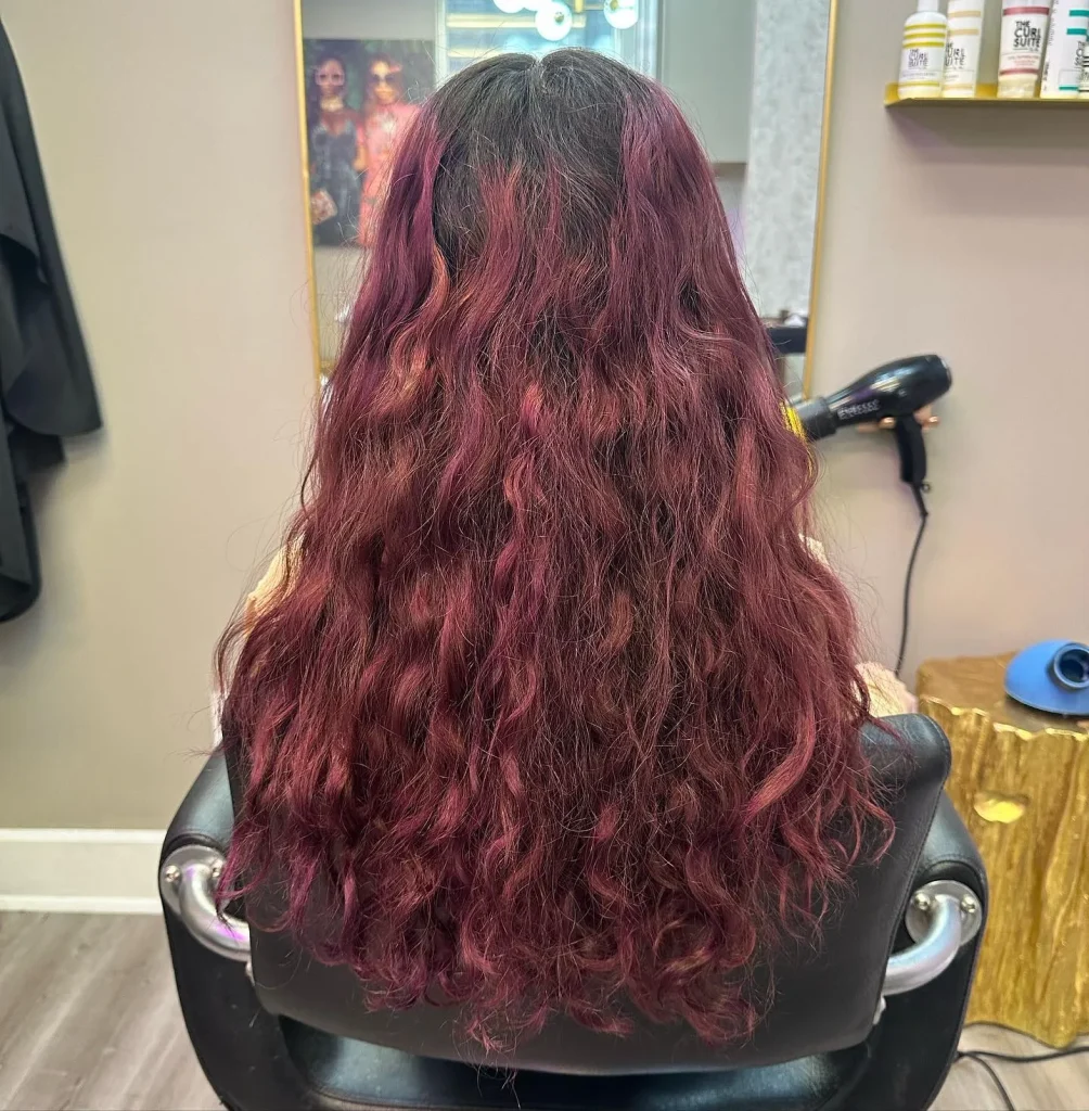Who says you can’t switch up your color for summer? While many people go lighter during warmer months, rich jewel tones like burgundy and wine shades are making a major comeback. This deep, dimensional color looks absolutely stunning on curly hair because the texture naturally creates highlights and lowlights throughout.